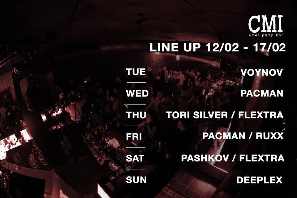 CMI afterparty bar приглашает на вечеринки. Гостей ждет музыкальное настроение от диджеев Pacman, Voynov, Pashkov, Flextra и других.