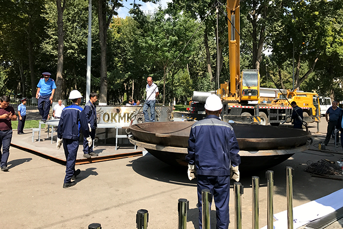 Репетиция приготовления самого большого плова в Узбекистане состоялась 18 августа в Алмалыке. В этот день более 50 именитых поваров со всей республики приготовили плов весом более 6 тонн. Все началось с идеи приготовить плов весом 5 тонн. На помощь пришел Горно-Металлургический комбинат, отливший казан объемов в 5 000 литров.