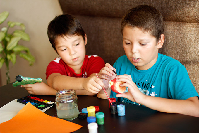 Что нужно: — 0,5 стакана муки — 0,5 стакана соли — 0,5 стакана воды — краски — кисточки — прозрачный лак
