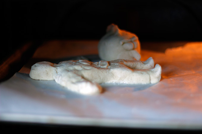 Поместите фигурки на противень, разогрейте духовку и выпекайте, точнее — сушите, на медленном огне до затвердения (минут 20). Заготовки приобретут матовый белый оттенок. При нашей жаре их вполне можно сушить на балконе, правда, ждать придется подольше.