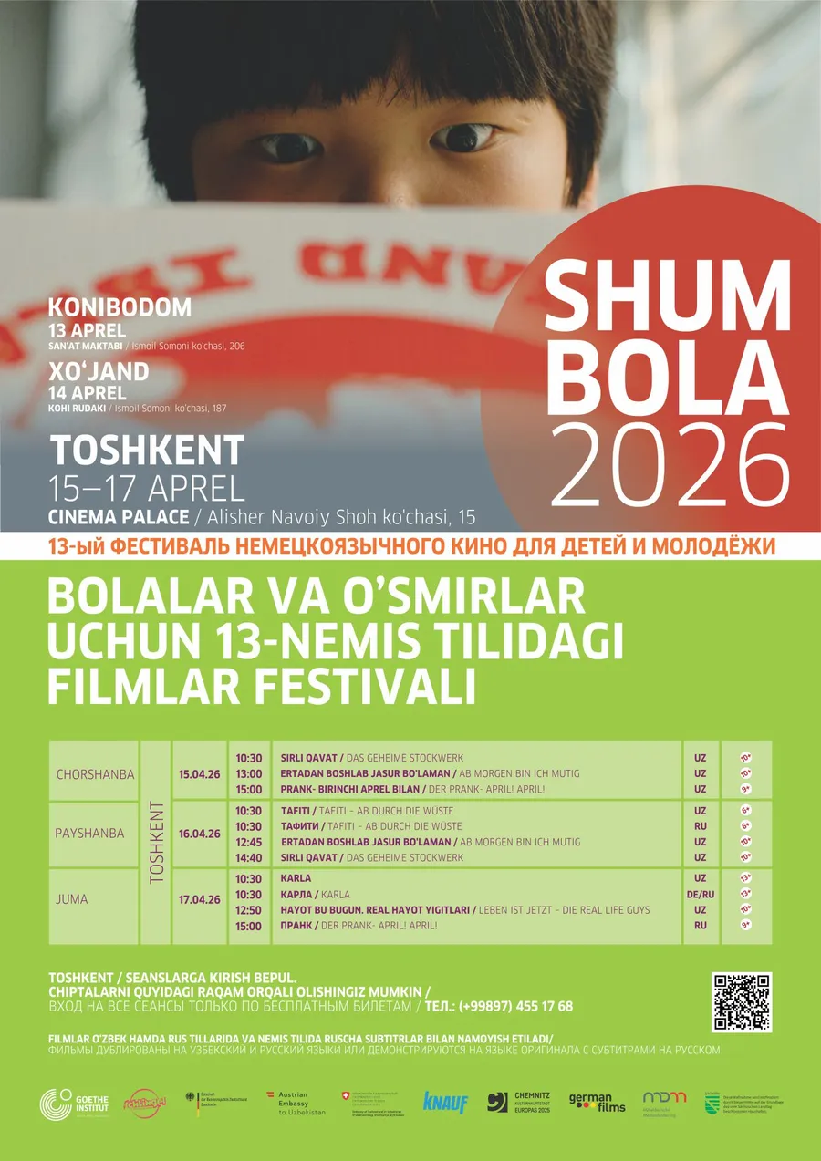 С 15 по 17 апреля в Ташкенте пройдет 13-й фестиваль немецкоязычного кино для детей и молодежи ShumBola 2026. Показы состоятся во Дворец кино имени Алишера Навои.