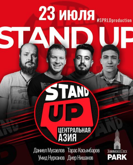 В парке Tashkent City пройдет Stand up концерт. Даниел Мусаелов, Тарас Косымбаров, Умид Нурханов и Диер Нишанов выступят на большой сцене парка со своими самыми интересными номерами.