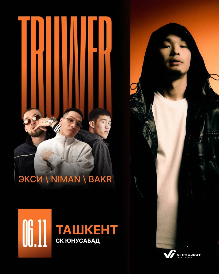 В спортивном комплексе «Юнусабад» состоится сольный концерт Truwer. Артист выйдет на сцену не один — вместе с ним выступят Ekci, Captown, Niman и Bakr.