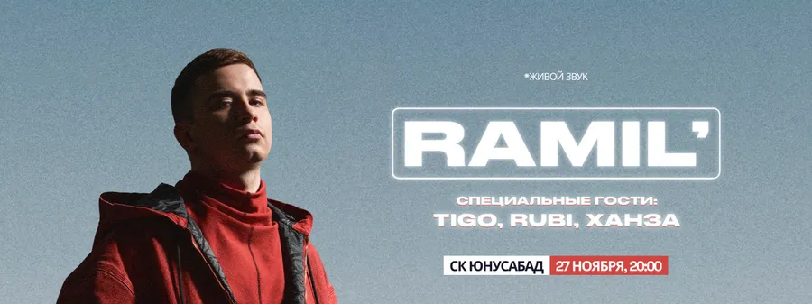 В спортивном комплексе «Юнусабад» состоится сольный концерт Ramil. Артист выйдет на сцену не один — вместе с ним выступят Tigo, Rubi и Ханза.