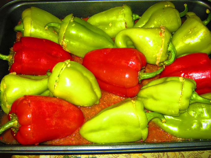 - Заполняем перцы фаршем, прикрываем их крышечками, укладываем в форму и заливам подливкой.