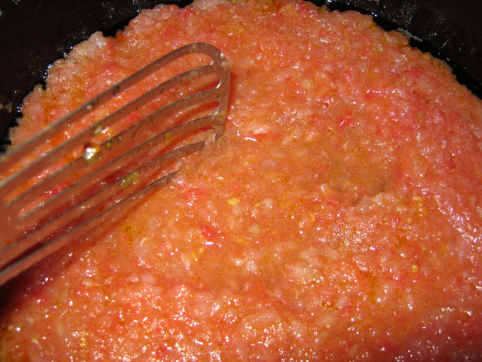 - Готовим заливку — 2 луковицы, помидоры пропускаем через мясорубку. Обжариваем до испарения жидкости, добавляем сметану и немного воды (тушим 5 минут ), добавляем специи по вкусу.