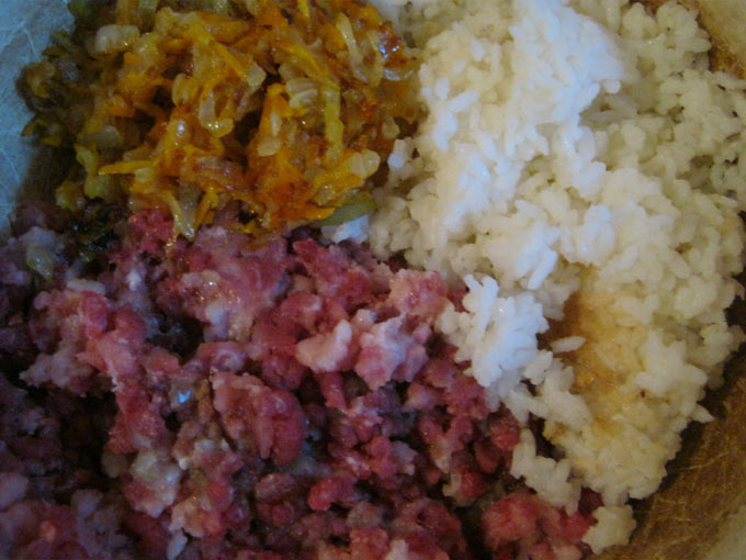 - Мясной фарш, отварной рис, обжаренный лук с морковью соединить и хорошенько перемешать, добавить немного воды (2-3 ст.л), приправить специями.