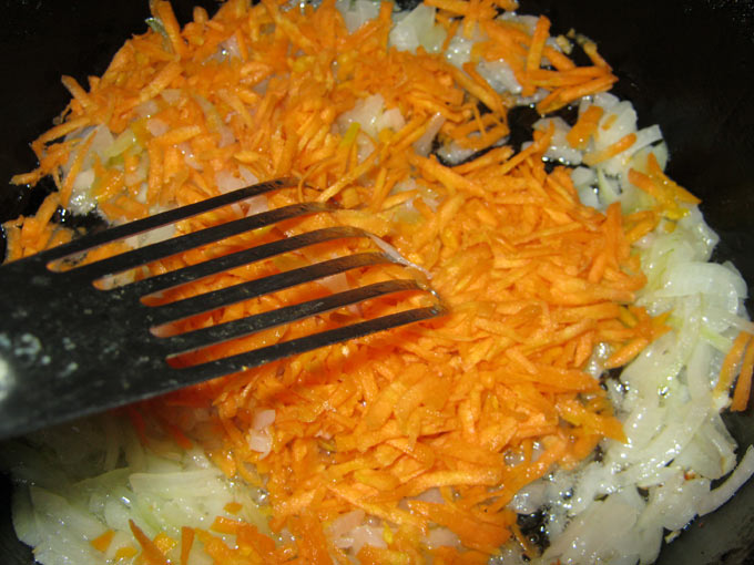 - Мясо пропустить через мясорубку. 2 луковицы мелко нашинковать и обжарить в небольшом количестве масла до прозрачности, морковь натереть на мелкой тёрке и обжарить вместе с луком.