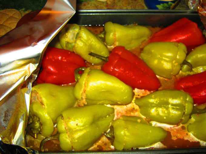 - Вынимаем перцы из духовки, снимаем фольгу и вновь ставим в духовку до готовности — на 30 минут.