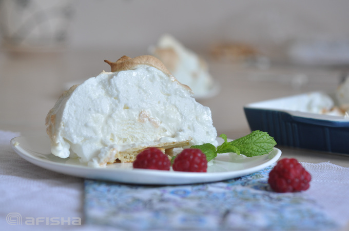 Это просто волшебство! Достаем из духовки десерт, разрезаем, а там…мороженое! Невероятно? На самом деле проще рецепта я еще не давала. Взбитые белки выполняют роль шубы и защищают мороженое от жара духовки. Название десерта «Аляска» напоминает не только о снежных пиках, но и о том, что зимой надо очень тепло одеваться. Для того, чтобы мороженое не растаяло, его кладут на печенье или бисквитную основу, а сверху тщательно обмазывают взбитыми белками.