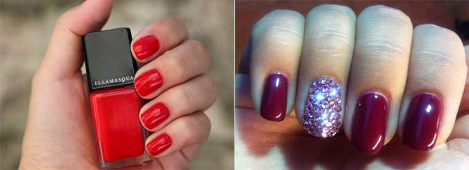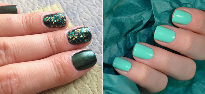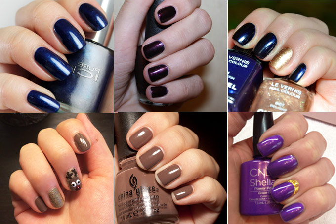 Обдумав свой новогодний образ — приступайте к маникюру. Конечно, ногти не должны вторить цветам total-look-а, но один главный цвет можно продублировать в каком-либо его оттенке. Тем самым, наиболее актуальными цветами новогоднего маникюра станут все оттенки синего, фиолетовый, сливовый, серый, изумрудный, коричневый и даже черный! Учтите, что перламутра в этих цветах лучше избежать.