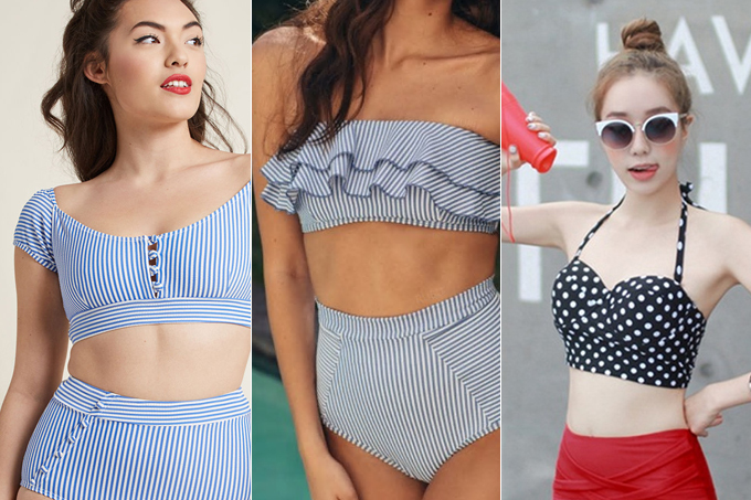 Купальники с плавками с высокой талией подчеркивают женственность фигуры. А ретро мотивы невольно отсылают к элегантным 50-м годам и иконам стиля того времени: Грейс Келли, Мэрлин Монро, Элизабет Тейлор. Расцветки таких моделей могут быть самыми разными — от привычного гороха и полоски до незатейливых цветочков и ромбиков.