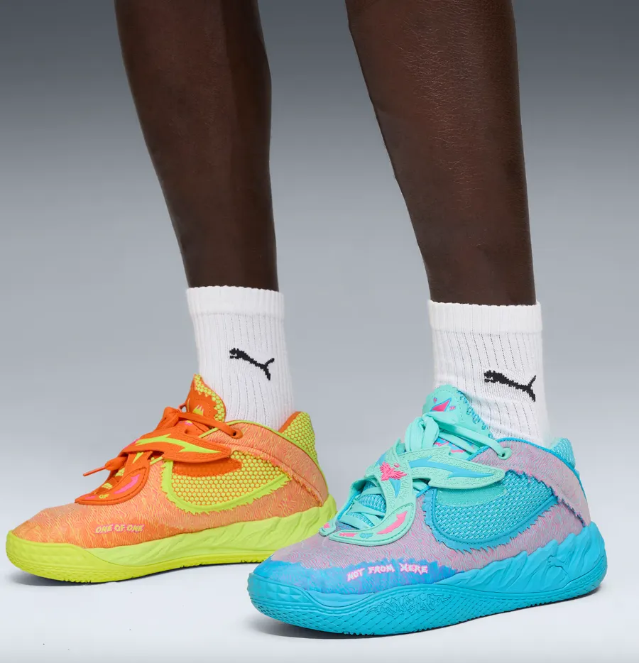 В центре — фирменная модель LaMelo Ball MB.05. Выпуск сочетает баскетбольную функциональность с дерзкой межпространственной эстетикой, передавая непредсказуемую энергию шоу через яркий контрастный дизайн.