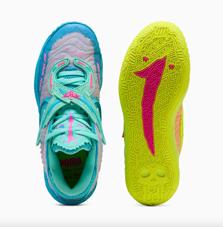 Также представлены кроссовки PUMA Inverse в двух выразительных цветовых вариантах — один вдохновлен легендарным портальным пистолетом Рика, а другой передает космические пейзажи шоу с помощью многослойных текстур и оттенков.