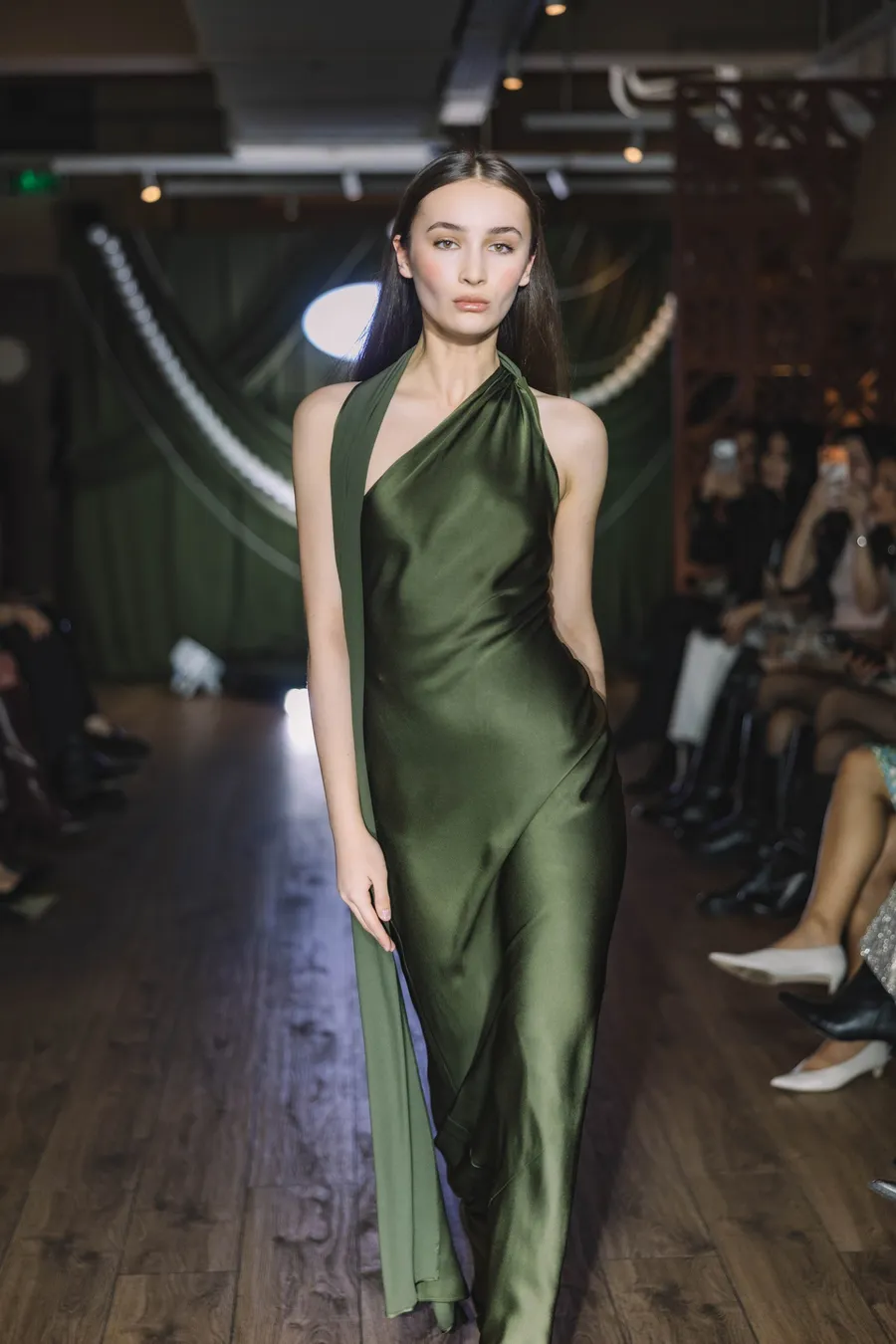 Когда свет в зале приглушили, на подиуме появились первые модели в вечерних образах из шелка. Почти все наряды были выполнены из этой ткани, которая делала силуэты легкими и подчеркивала движение.