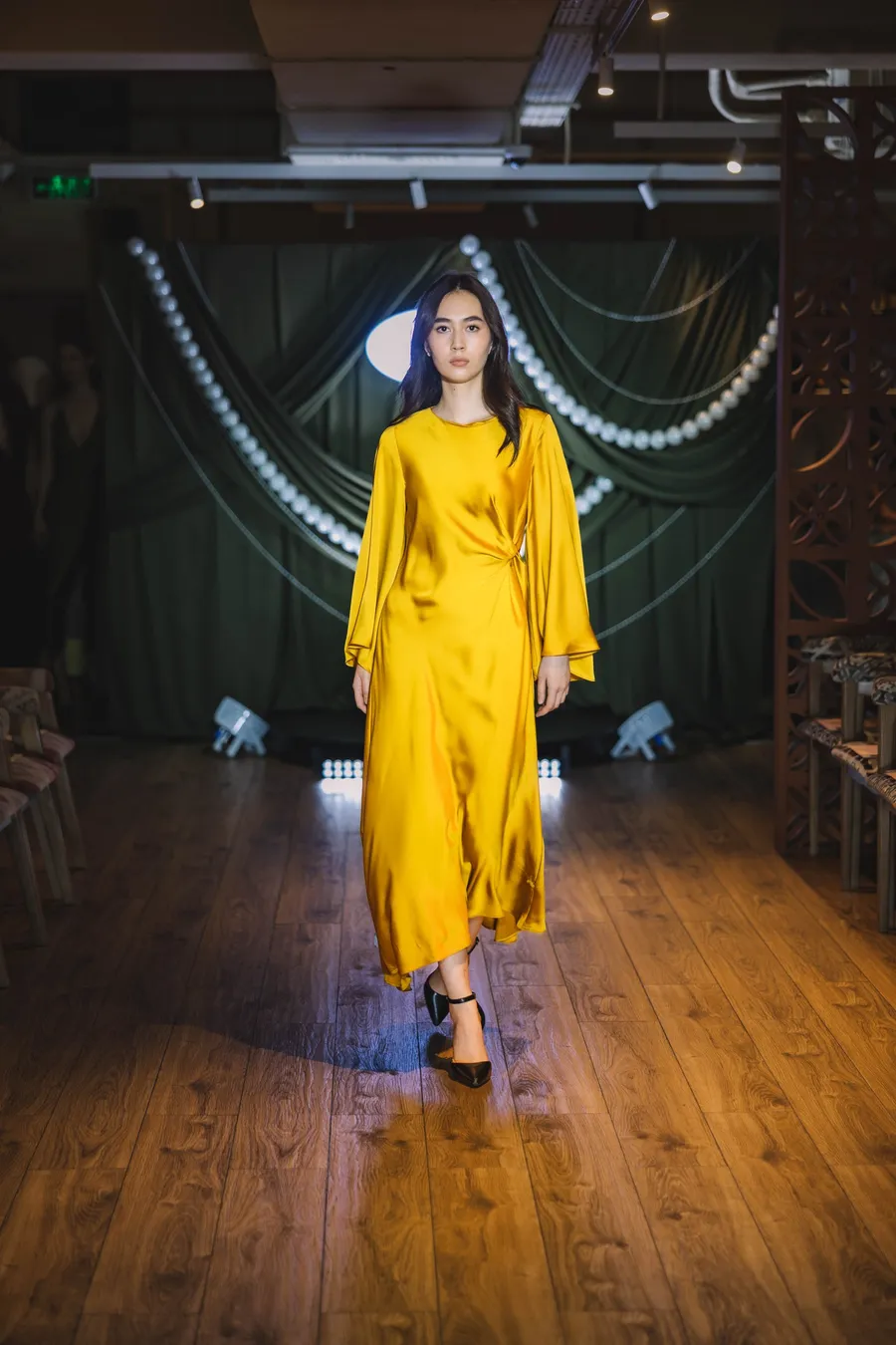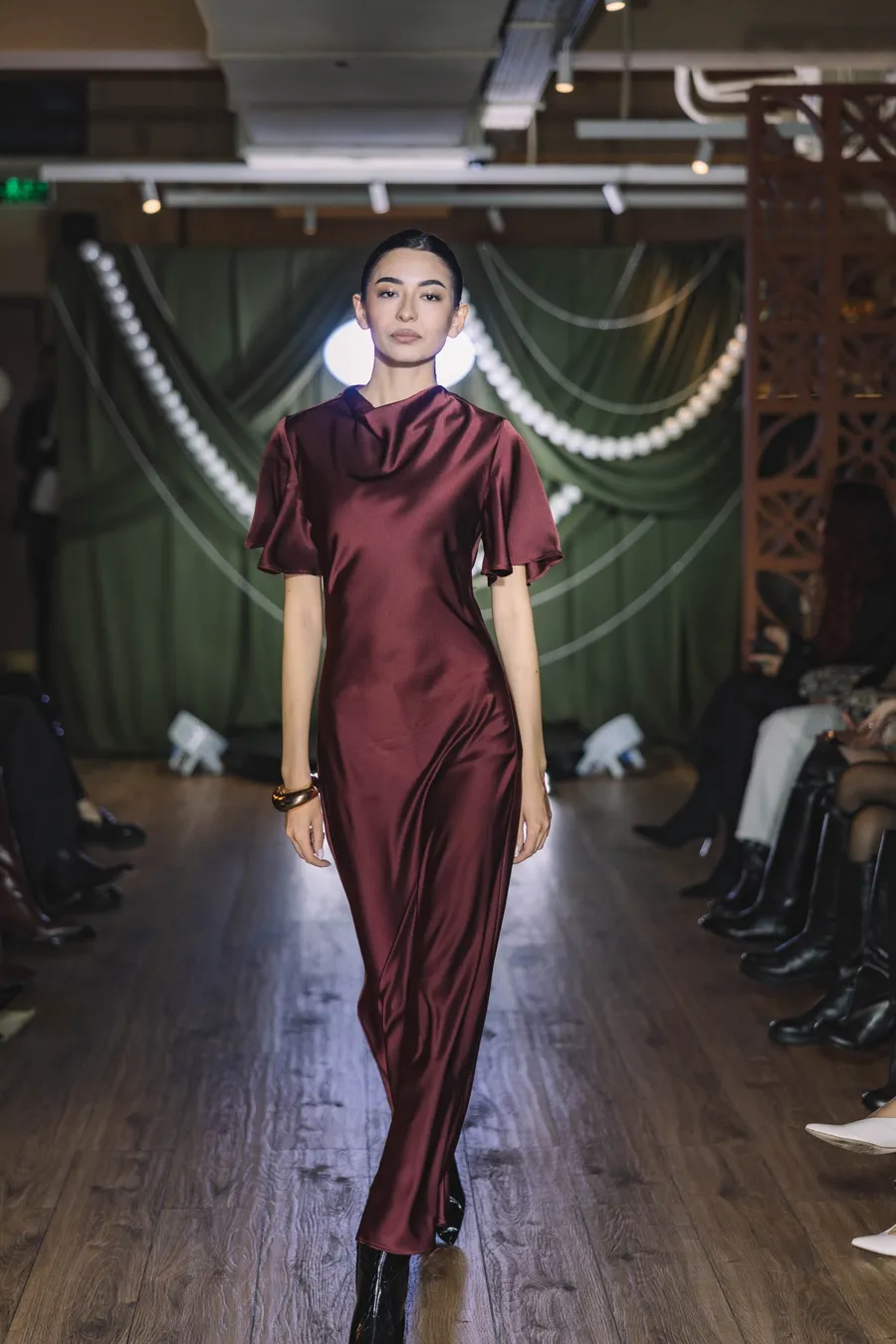 Линия построена вокруг вечернего гардероба и решений для особых событий. На подиуме представили струящиеся платья длины макси, строгие костюмы с четкой линией плеч, лаконичные комплекты и закрытые элегантные модели с минималистичными деталями.