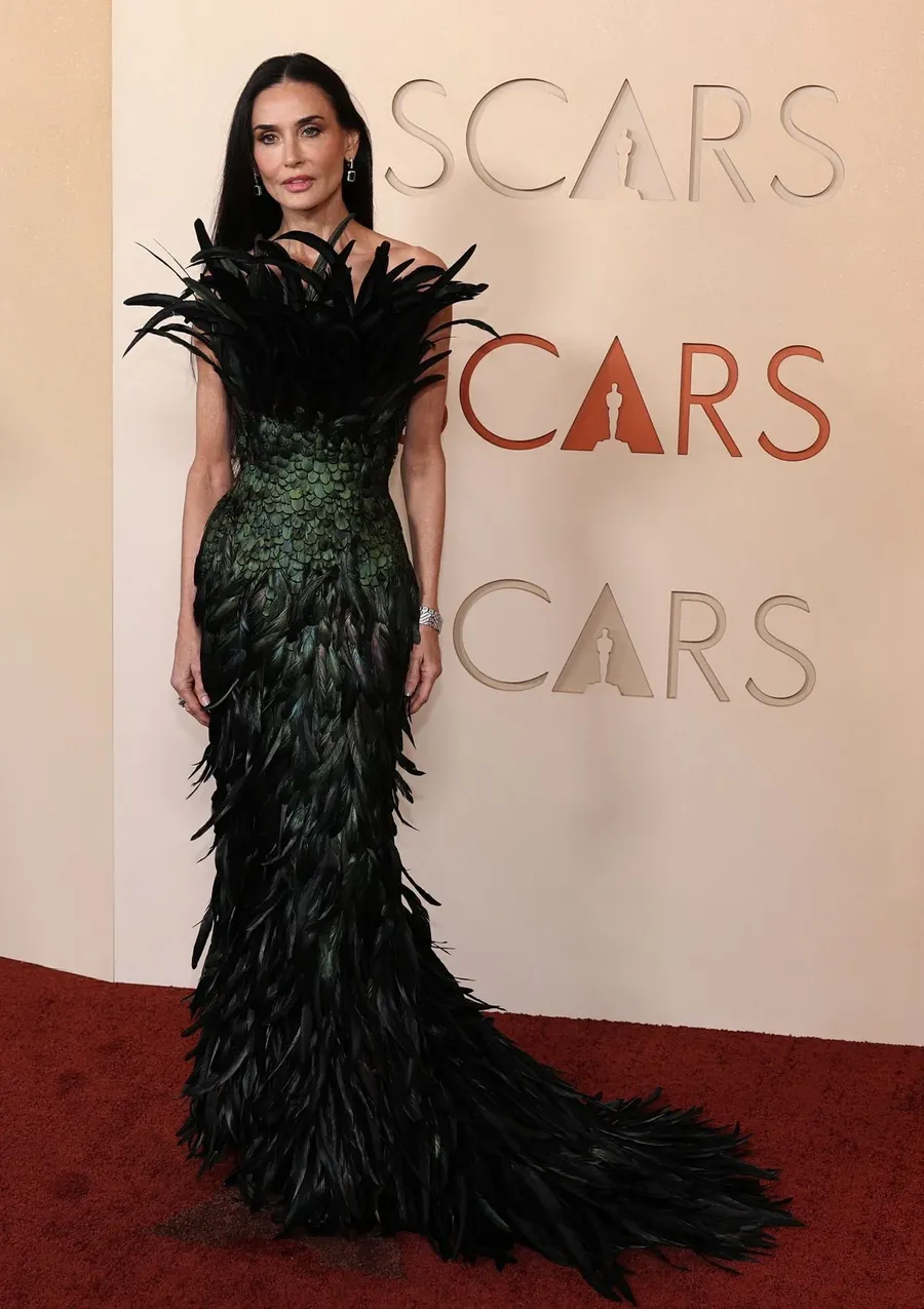 Деми Мур решила не отставать от трендов и пришла в пернатом платье от Gucci.