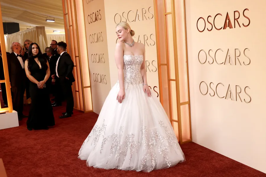 Эль Фаннинг появилась в белоснежном свадебном платье от Givenchy и с ожерельем Cartier 1903 года.