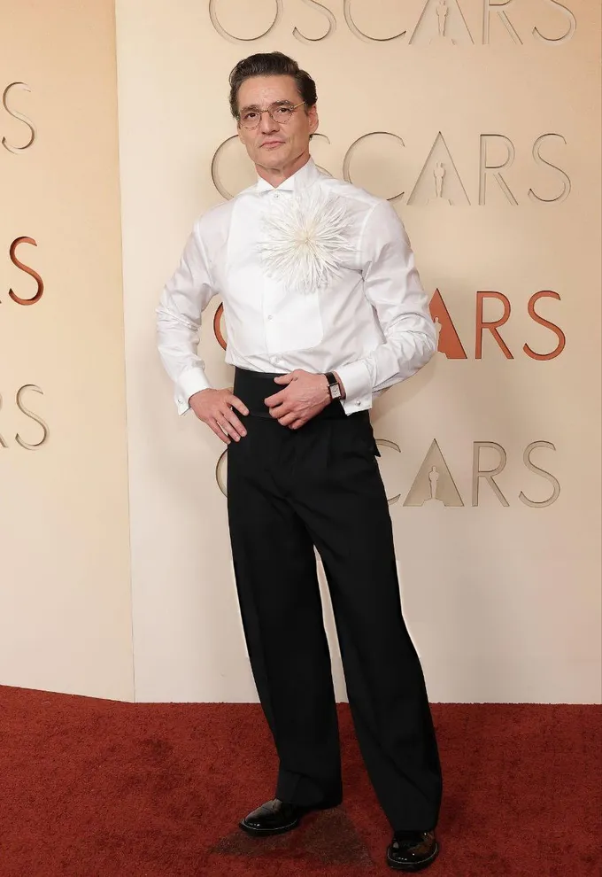 Сменивший образ Педро Паскаль решил разбавить классический образ рубашкой с цветком из перьев от Chanel.