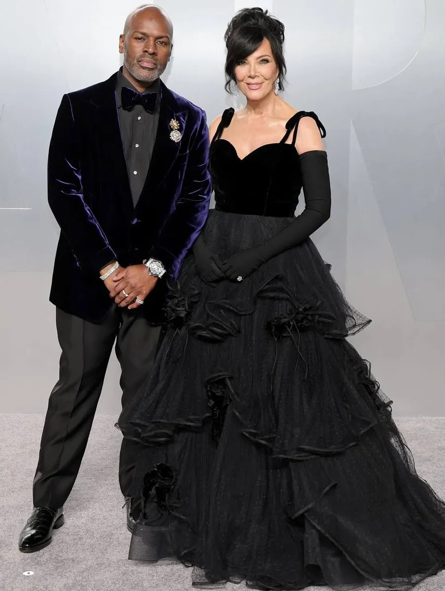 Крис Дженнер в винтажном платье Valentino Haute Couture Fall/Winter 1995 позировала со своим возлюбленным Кори Гэмблом.
