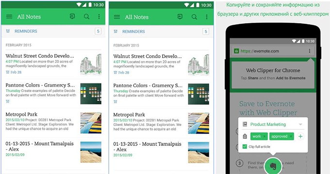 Программа представлена в виде многофункционального блокнота, который будет очень полезен не только для делового человека, но и для всех, кто хочет упорядочить весь сумбур в жизни. Главная идея Эверноут: запомнить всё. С помощью него можно легко сохранять рукописный текст, голосовые и напечатанные заметки, фотографии, раскидывать всю эту информацию по папкам (блокнотам), а также защищать их паролем. Ещё приложение способно переводить файл формата PDF в текстовый документ, делать снимки документов, а после находить их по фрагментам текста, синхронизироваться с десктопной версией сервиса.