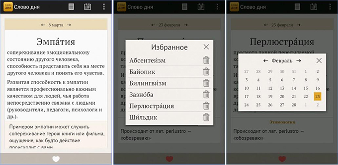 Каждый день приложение находит одно нетривиальное и по-настоящему красноречивое слово, прилагая к нему пояснение и примеры. Критерии отбора слов различны, но чаще всего приводят такие слова, которые редки в употреблении. Если термин вам понравится или же не знаете, но хотели бы запомнить его значение, то можно добавить в избранное, нажав на «сердечко». При помощи кнопки «календарь» можно повторить слова за предыдущие дни.