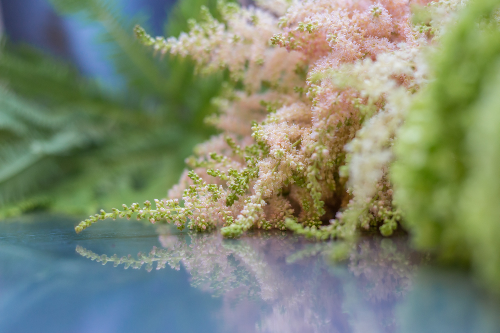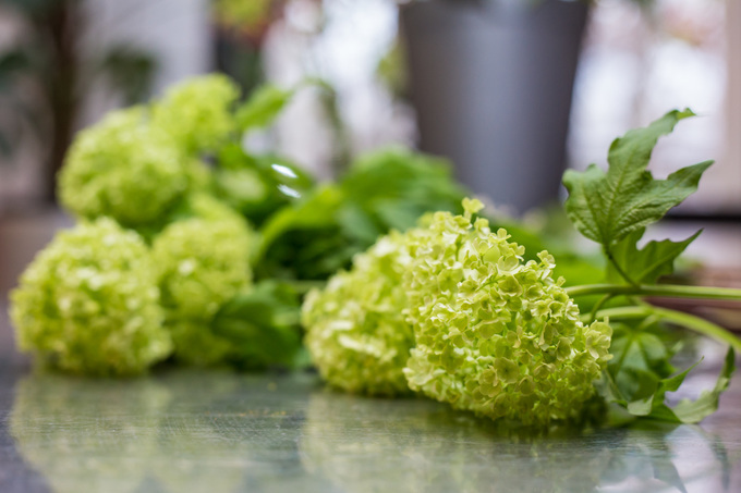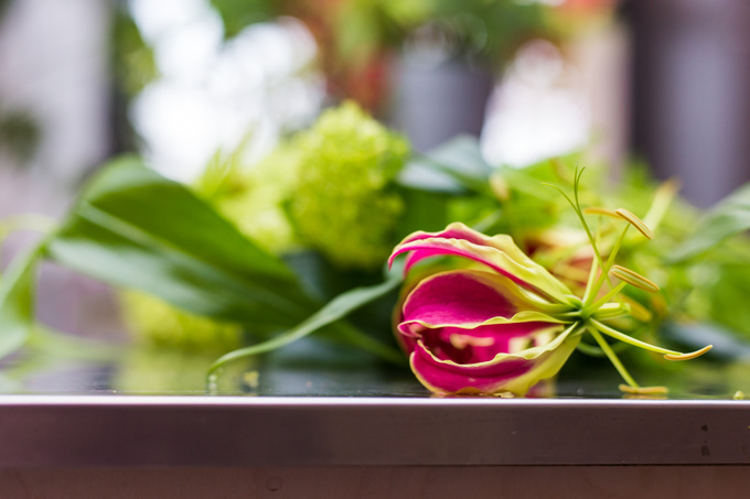Глориоза – цветок похожий на пламя, элегантный и утонченный. С ним нелегко работать, он цепляется за все своими крючочками на кончиках листьев. Вибурнум поддерживает глориозу своими, клонящимися от тяжести соцветий стеблями, а нежные колоски астибе играют с глориозой на контрасте.