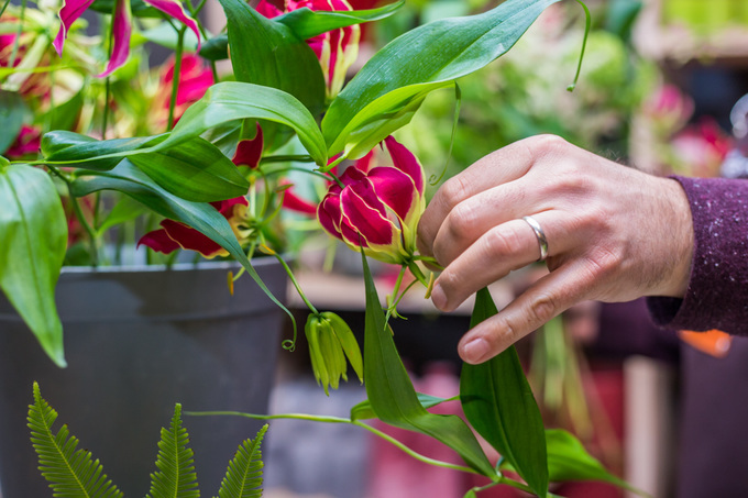 «Я делаю легкий и динамичный букет со свободной постановкой цветов, не прибегая ни к каким изысканным техническим приемам. Это не самый сложный букет, но здесь важна подборка материала, чтобы цветы, которыми я дополняю букет, могли проявить все особенности глориозы — главного цветка в моем букете».