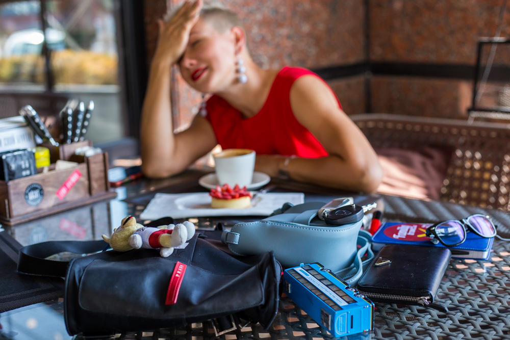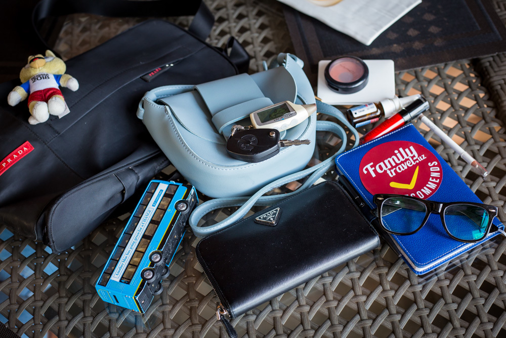У меня очень «мамская» сумка. Как правило, я всегда ношу свою сумочку и рюкзак. Я из тех мам, которые на всякие случай везут с собой весь дом. В моей сумке редко найдешь крем или другую косметику, зато всегда с собой вожу аптечку. Меня это часто спасает. Еще беру кучу одежды на все случаи жизни (смеется). Последнее время пользуюсь кошельком, так как слышала, что деньги любят порядок. Также беру записную книжку, на случай, если разрядится телефон. А малыш ответственен за игрушки в моей сумке.