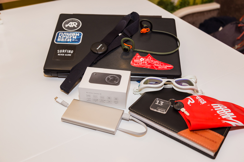 У меня в рюкзаке всегда лежит ноутбук, power-bank для телефона, нагрудный пульсометр, беговые наушники, ключи от раздевалки. Очки и шапочка для плавания — я по утрам хожу в бассейн. Блокнот рабочий и камера для съемки моего блога на YouTube «Беглый взгляд».