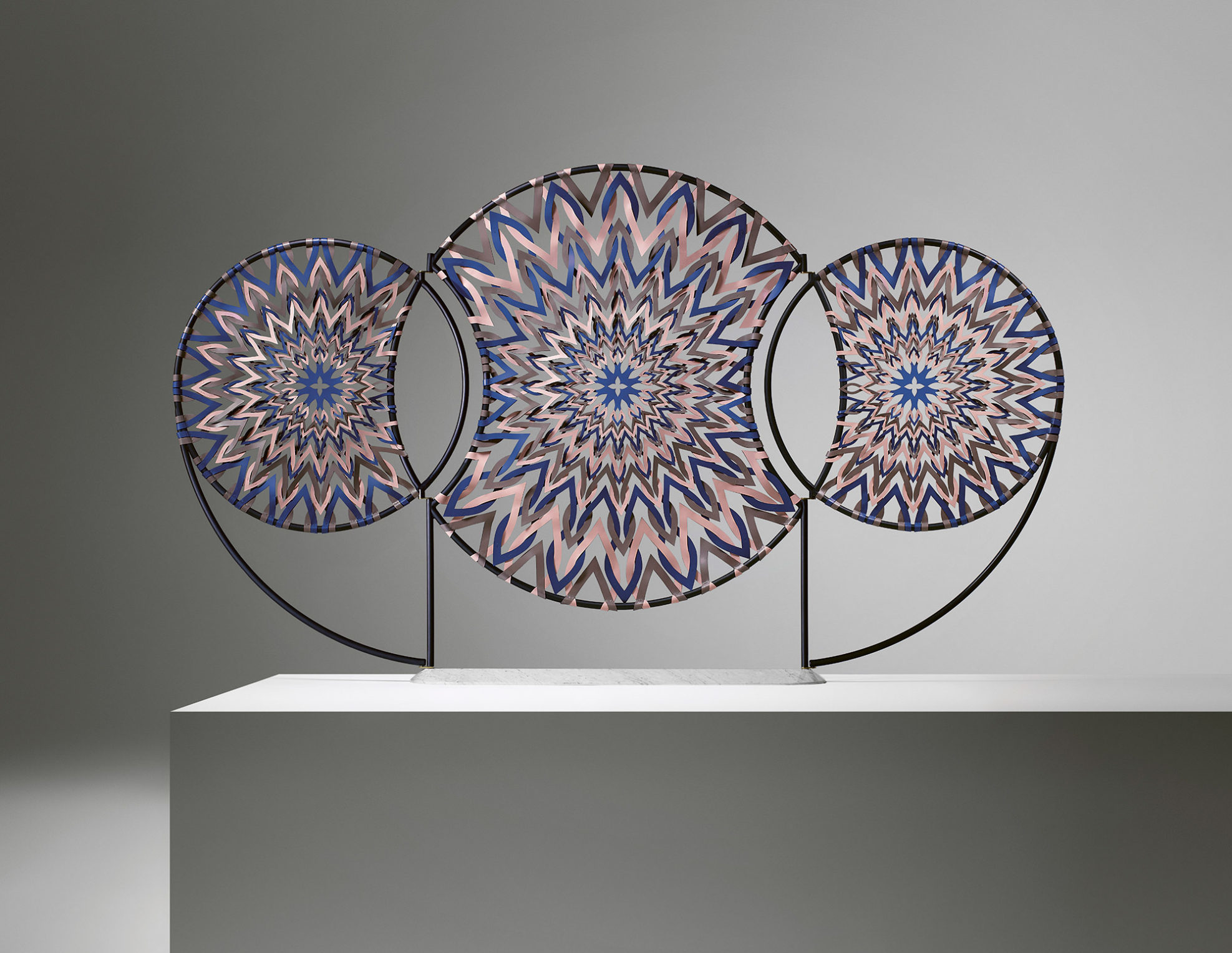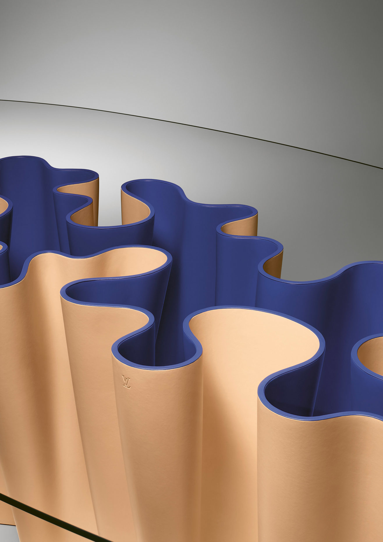 Итальянская студия Zanellato/Bortotto представила декоративную ширму Mandala Screen (буддийский и индуистский орнамент). Ширма состоит из металлических пластин, на которых из кожаных ремешков сплетена фирменная монограмма цветка Louis Vuitton.