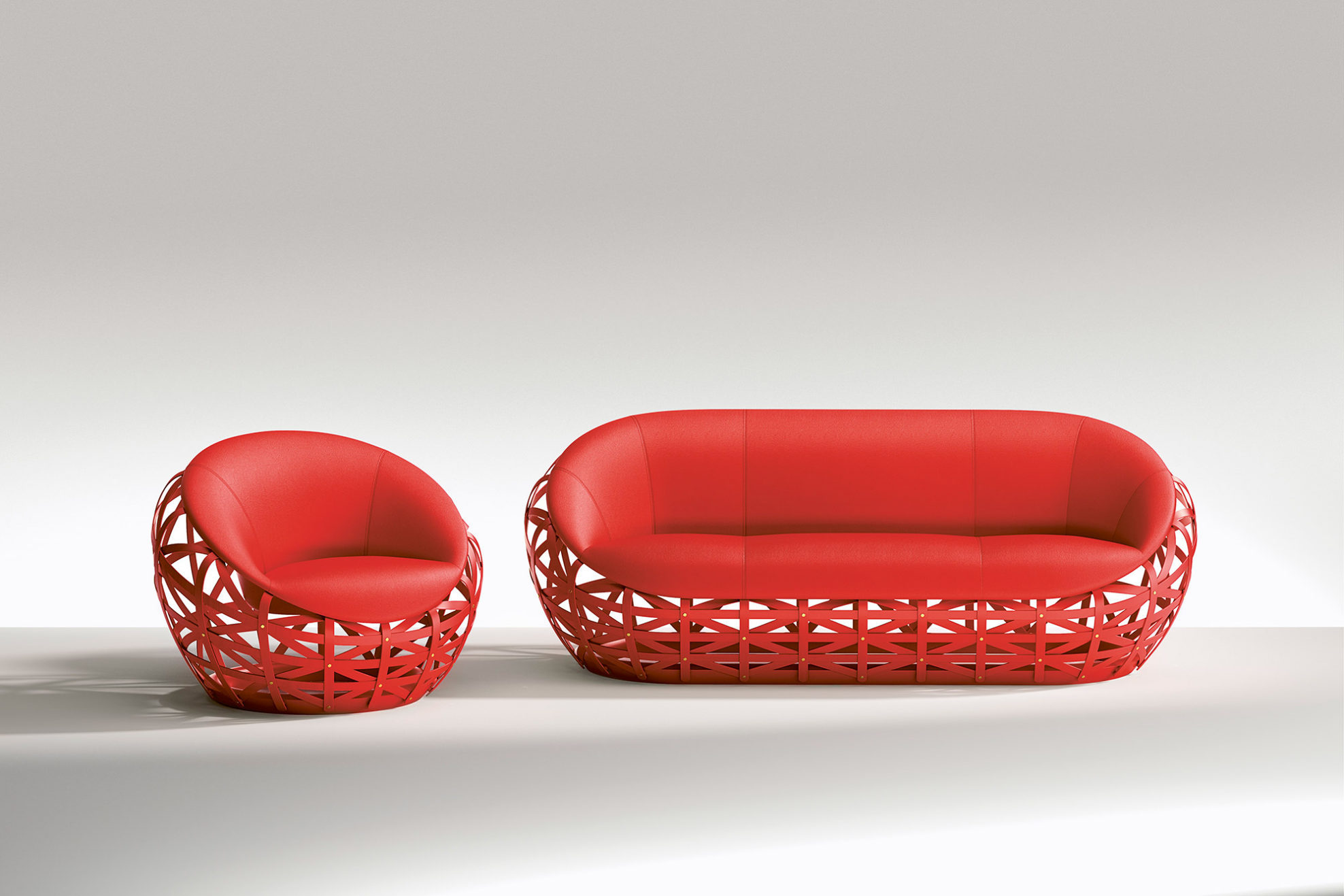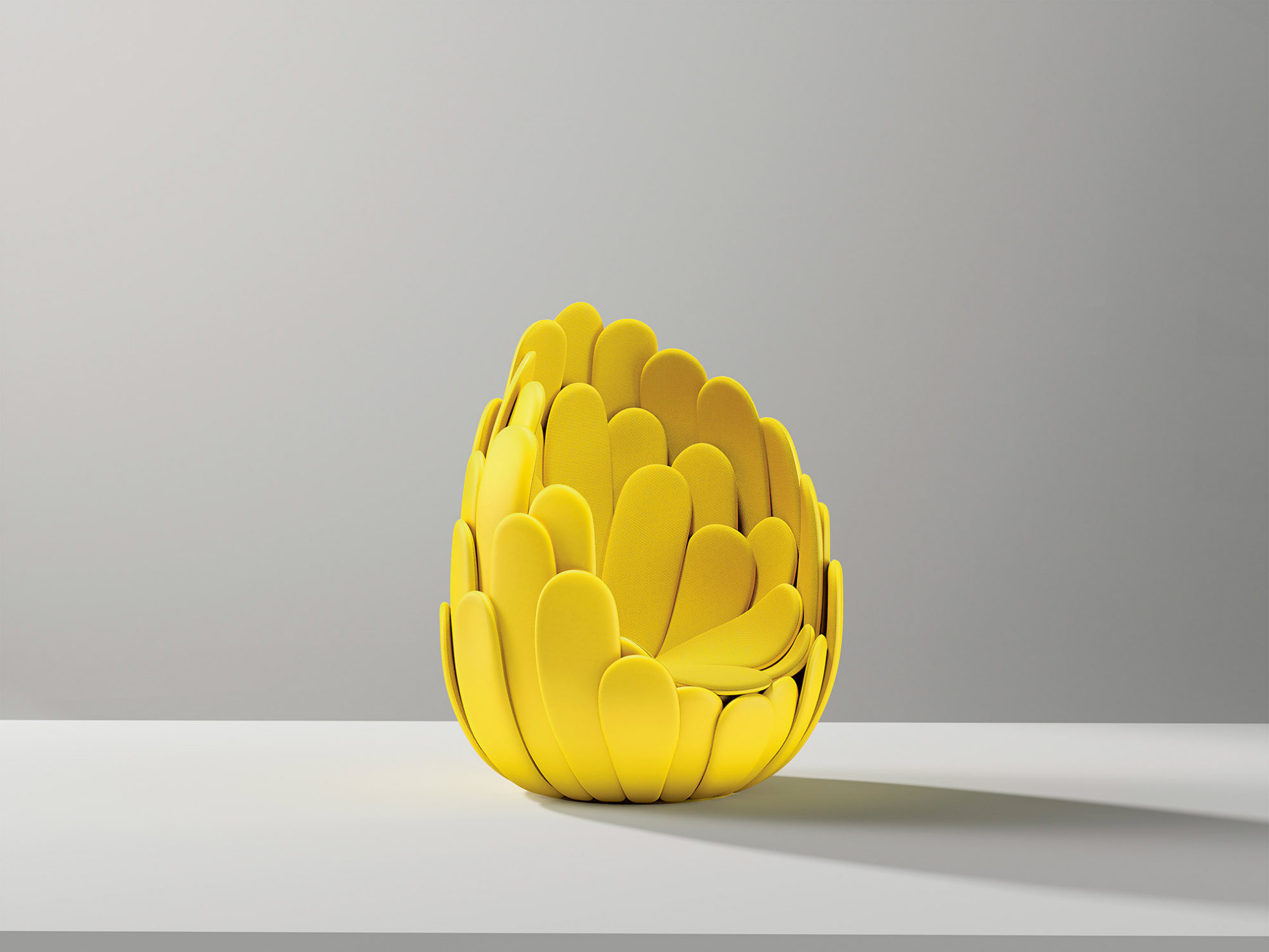 Уютное кресло-кокон Bulbo презентовали братья Кампана. По форме оно напоминает тропический цветок, его внешняя сторона обшита тонкой кожей, а внутренняя — тканью.