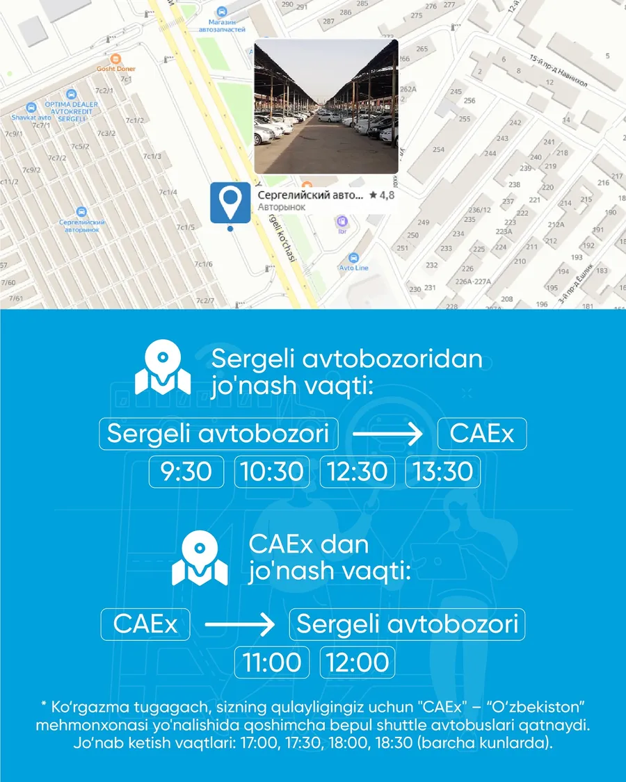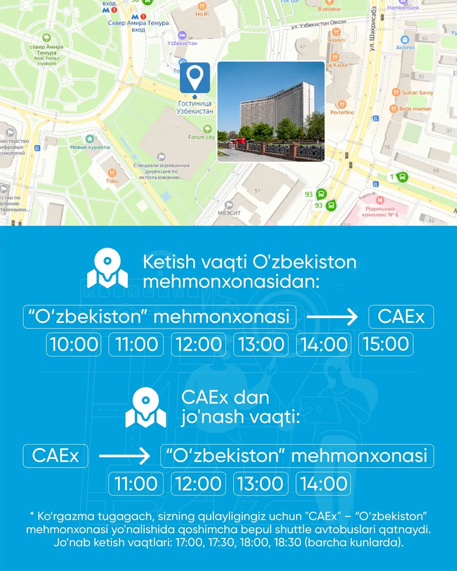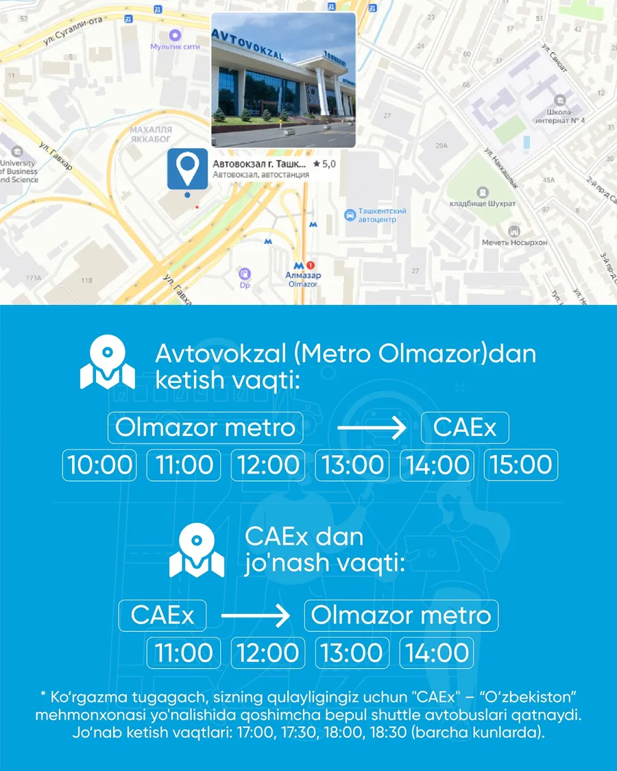 После завершения выставочного дня будут организованы дополнительные бесплатные автобусы по маршруту CAEx — гостиница «Узбекистан». Время отправления: 17:00, 17:30, 18:00 и 18:30.