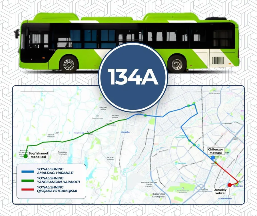 С 29 октября автобусный маршрут №134 изменен. Он продлевается от поселка Назарбек до махалли Богишамол, а с другой стороны — сокращается: конечная остановка теперь станция метро «Чиланзар» вместо «Южного вокзала».