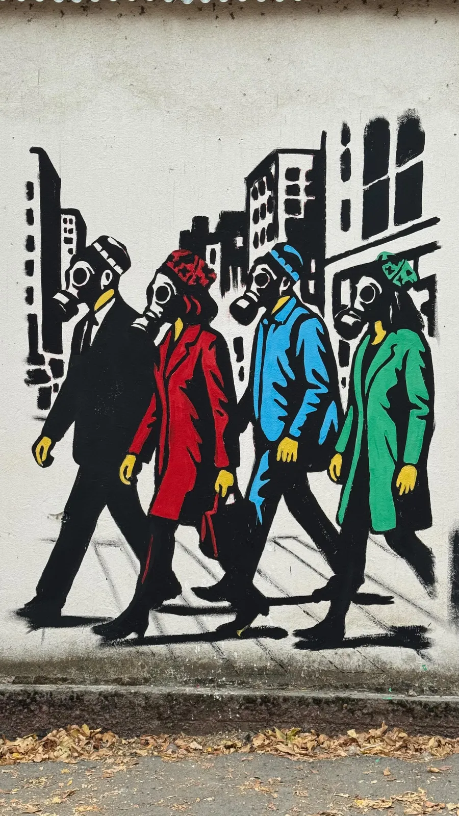 На изображении — четыре человека в защитных масках, идущие по городу. По замыслу автора, граффити отражает ухудшение качества воздуха в Ташкенте и призывает обратить внимание на экологическую ситуацию.