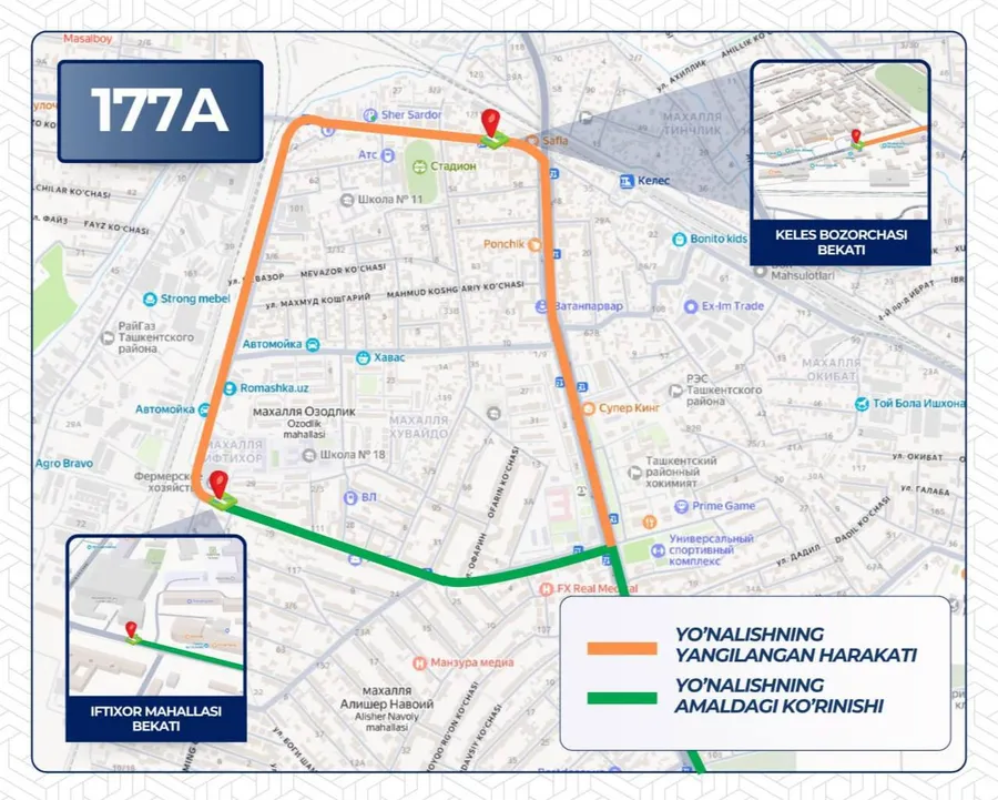 Теперь автобусы будут следовать дальше прежнего конечного пункта — остановки «махалля Ифтихор» — и продолжат движение по улице Ёшлик до остановки «Келес бозорчаси» (улица Келес шох).