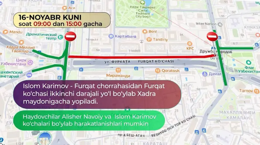 9:00—15:00 — закроют участок Фурката (от пересечения с Ислама Каримова до площади Хадра). Объезд: по улицам Навои и Каримова.
