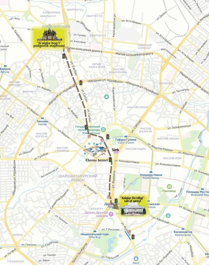 Далее колонны пройдут по маршруту: «Парк Победы» → Государственный музей природы → рынок «Чорсу» → Ташкентский цирк → Дворец искусств «Дружба народов».