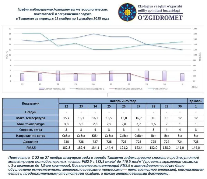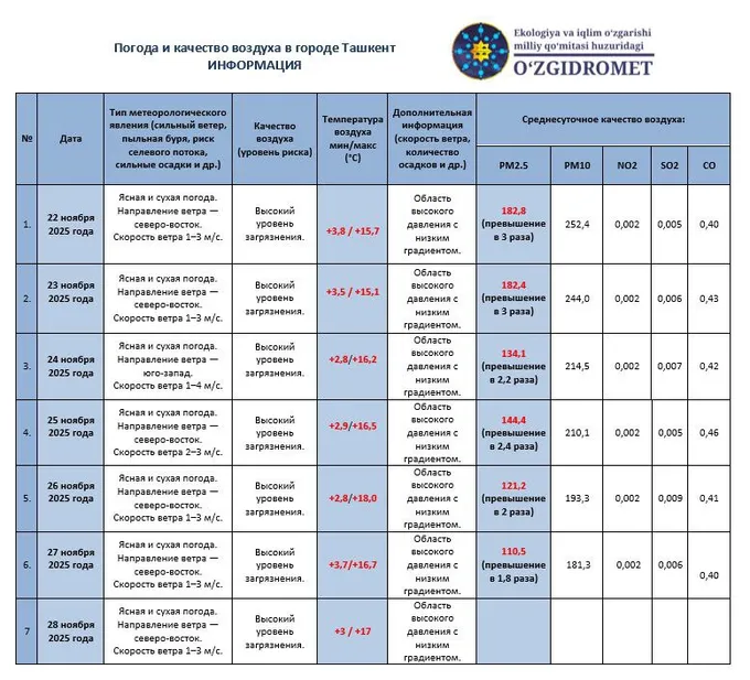 В Ташкенте и ряде регионов сохранится неблагоприятная погода, из-за которой воздух останется загрязненным. По данным Узгидромета, над страной удерживается холодный антициклон — именно он вызывает температурную инверсию.