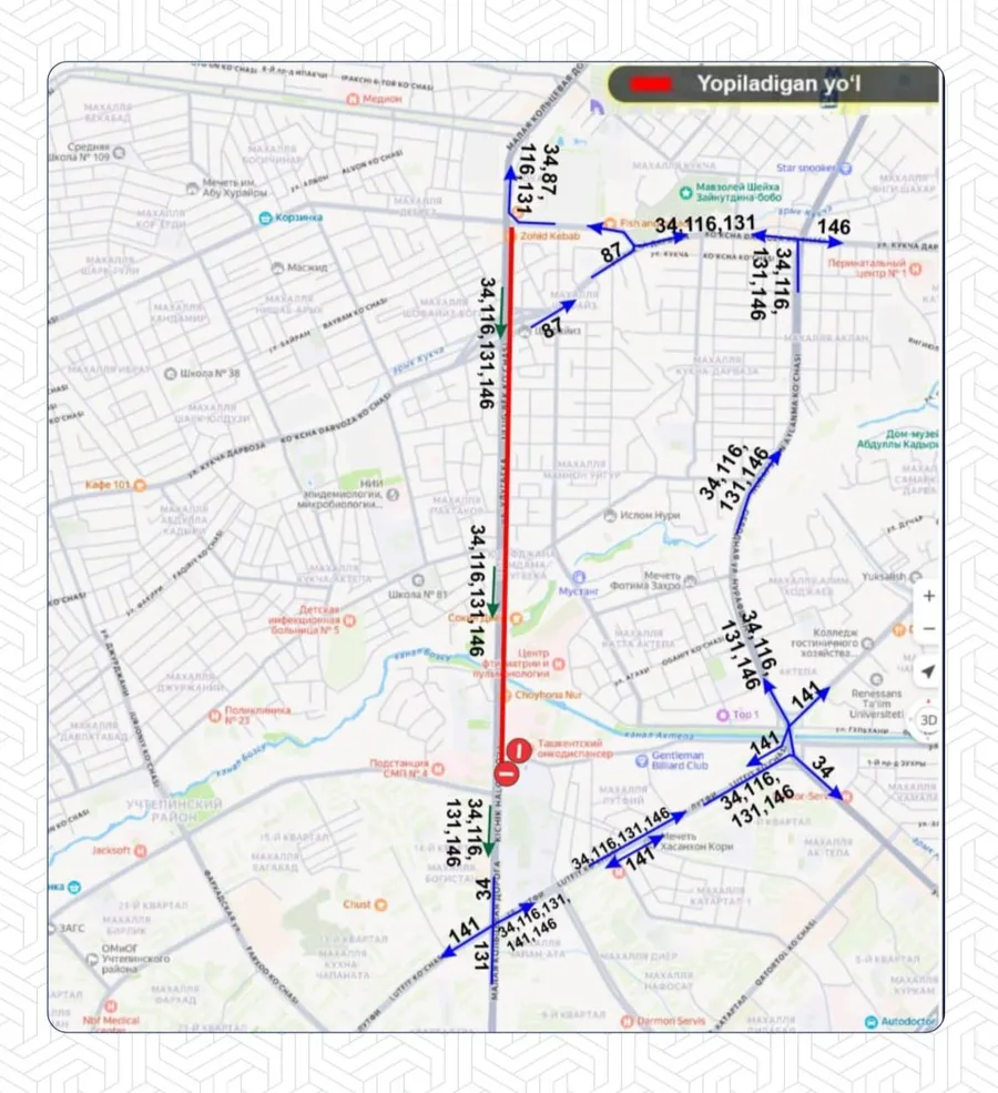 В Учтепинском районе Ташкента из-за ремонтных работ движение по участку Малой кольцевой автодороги — от улицы Фозилтепа до пересечения с улицей Бешкайрагач — будет временно ограничено в одностороннем порядке. Ограничение действует с 27 ноября, 22:00, до 1 декабря, 22:00.