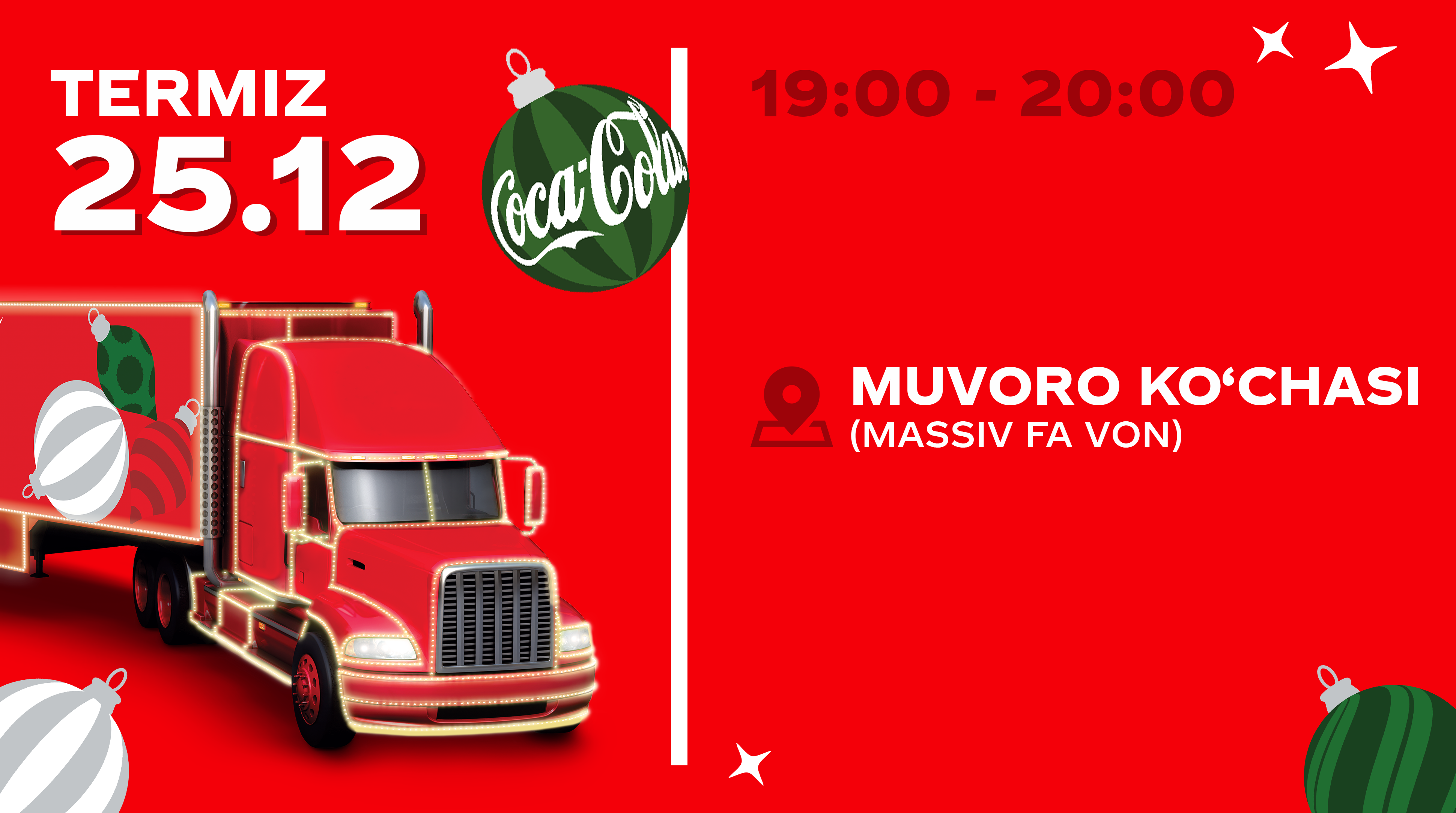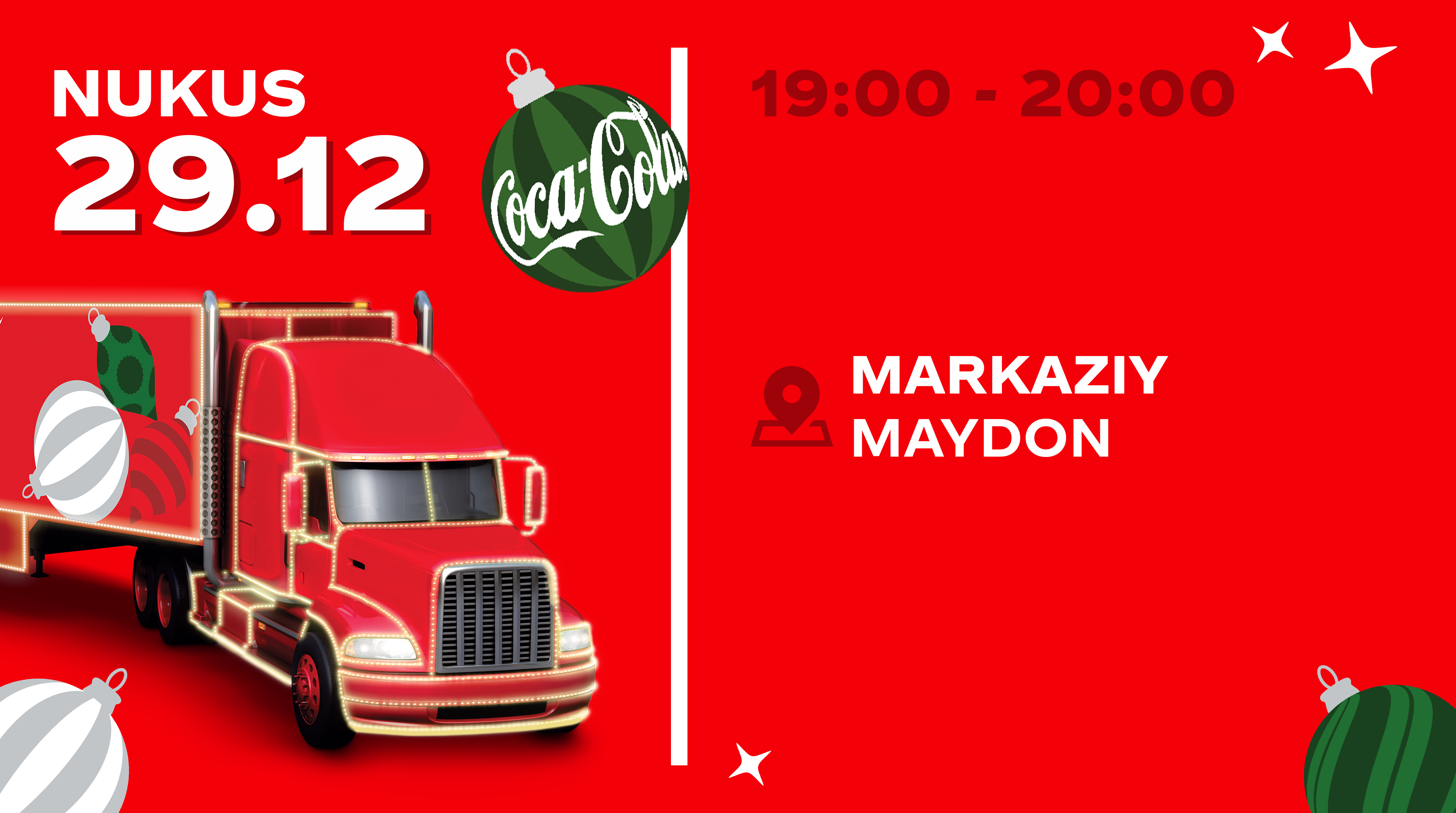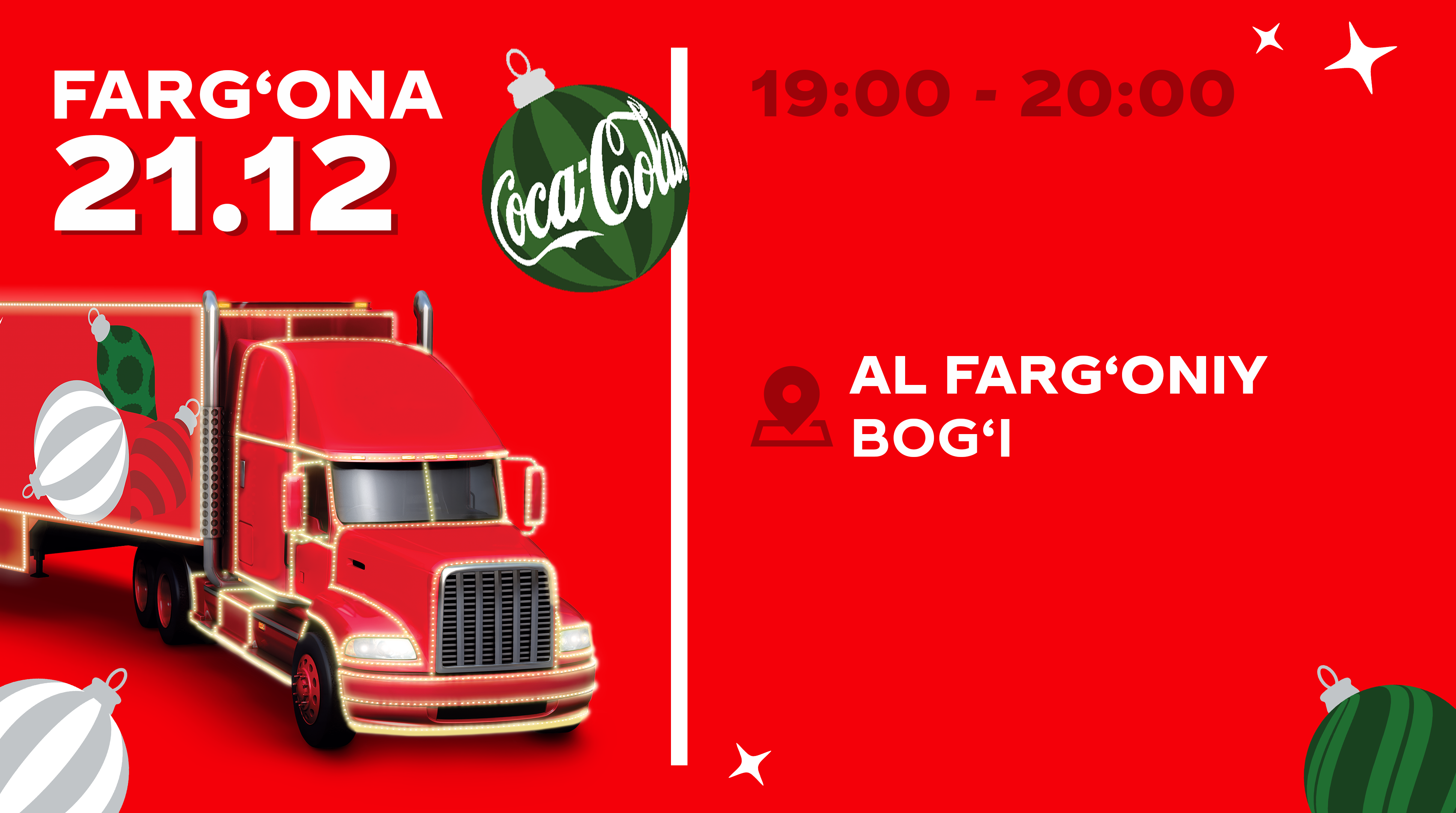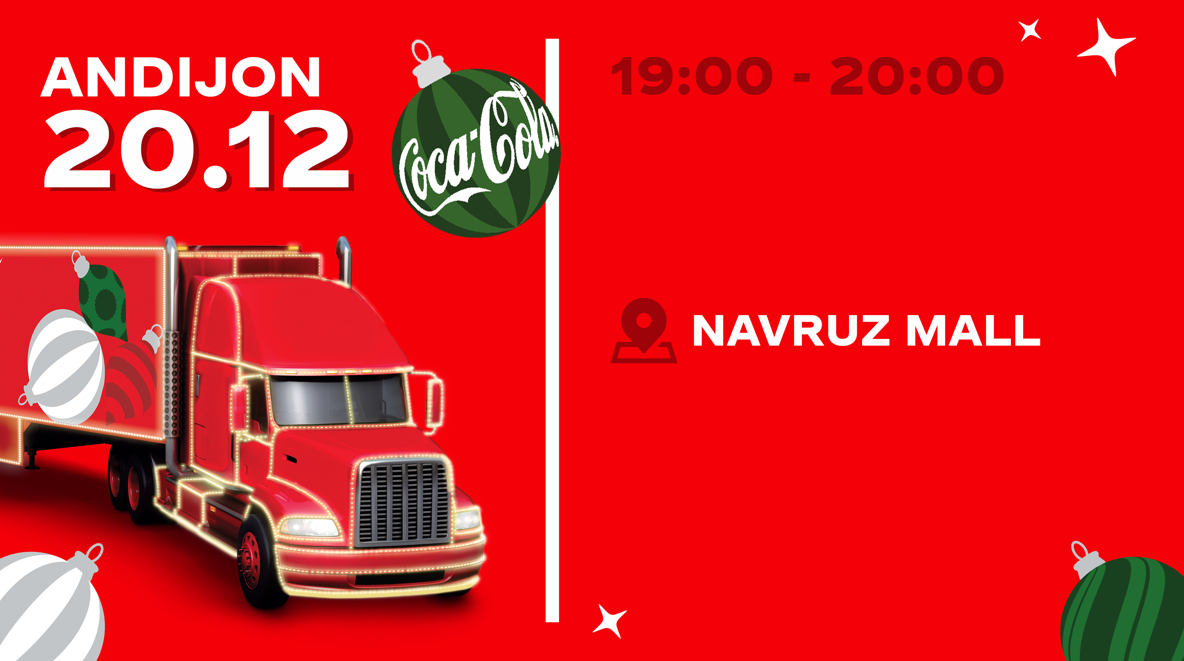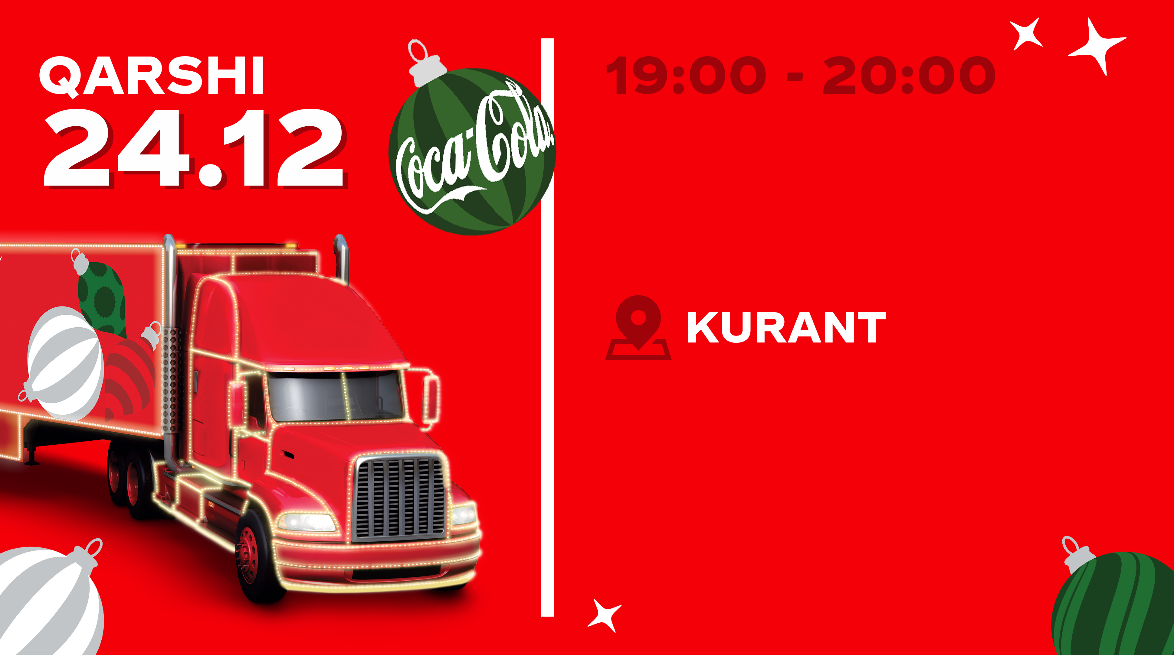 Начиная с 19 декабря, по городам Узбекистана отправится новогодний автопробег грузовиков Coca-Cola. Его можно будет увидеть в нескольких городах Узбекистана — Намангане, Андижане, Фергане, Самарканде, Карши, Термезе, Бухаре, Хиве, Ургенче и Нукусе.