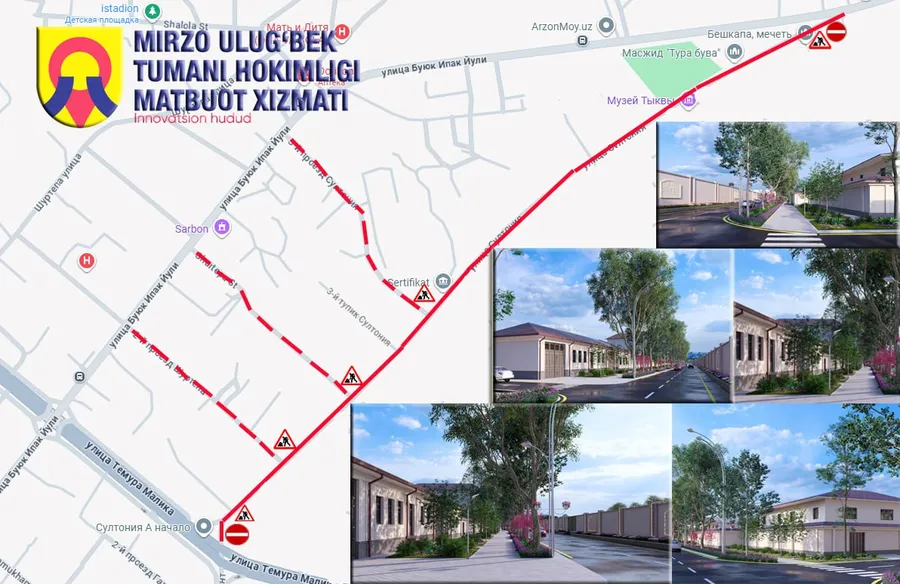 Также частично будет ограничено движение на прилегающих улицах: Шуртепа, Шуртепа 1-й тупик и Султония 5-й тупик.