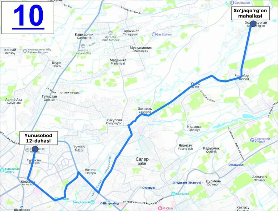 С 3 марта в столице начал работу новый автобусный маршрут — №10, соединяющий махаллю «Ходжакурган» Кибрайского района Ташкентской области с 12-м кварталом Юнусабадского района Ташкента.