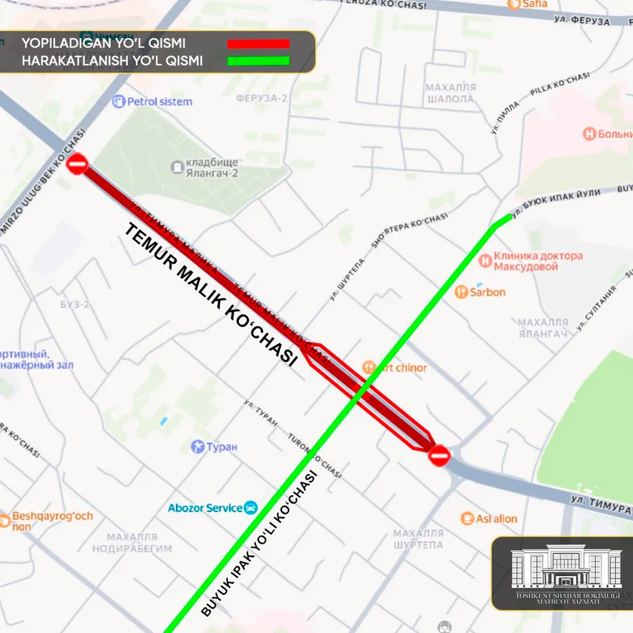 При этом движение по улице Буюк Ипак Йули сохраняется, однако съезды и выезды с нее на улицу Темура Малика будут временно закрыты.