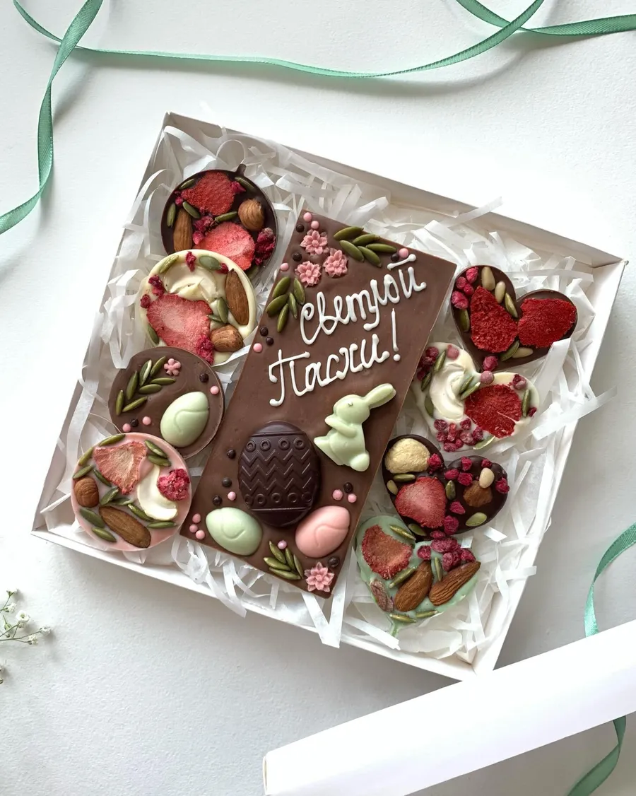 - шоколадные яйца к Пасхе: четыре вида натурального шоколада без красителей (белый шоколад с цельной фисташкой, карамельный шоколад с миндалем, молочный шоколад с фисташковой начинкой, розовый шоколад с ягодным вкусом) набор из девяти штук — 400 000 сумов.
