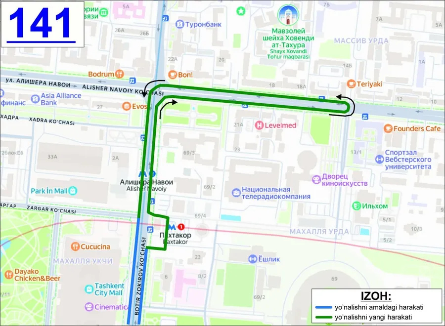 Маршрут №141 («Карвон бозори — метро Пахтакор») также частично изменит путь: теперь он будет проходить через улицы Батыра Закирова и Навои с заездом к остановке у кинотеатра имени Алишера Навои.