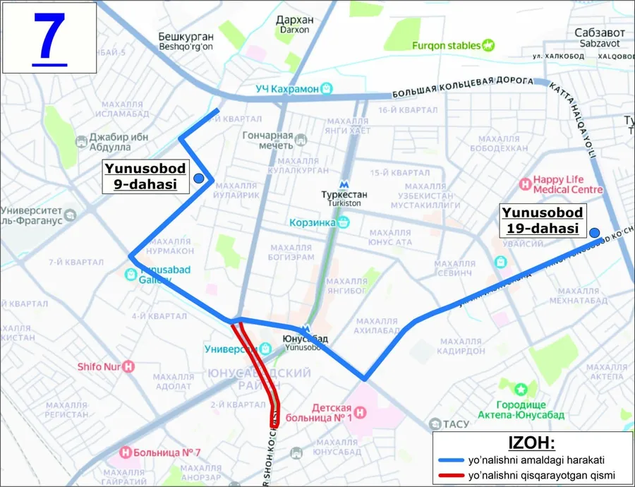 У маршрута №7 изменится схема движения в одном направлении: между каварталами 9 и 19 Юнусабада — теперь автобусы будут ходить по улицам Янги шахар и Рихсилий, без выезда на улицу Амира Темура.