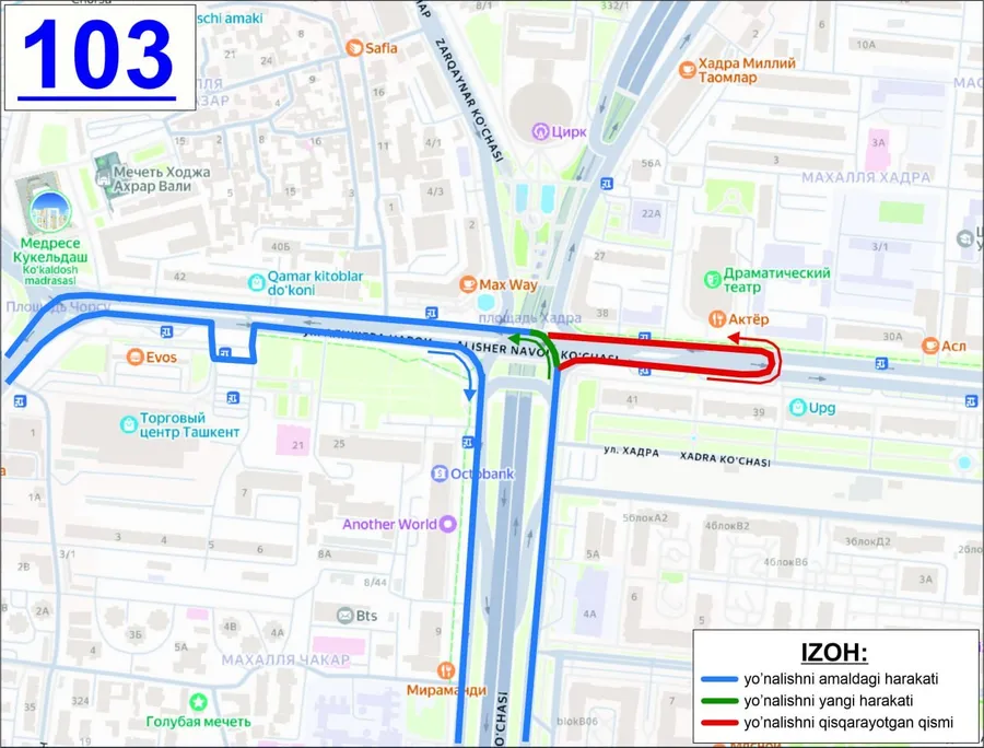 У маршрута №103 («Чиланзар буюм бозори — Чорсу») также изменится движение: автобусы будут сразу поворачивать на улицу Навои налево при движении с улицы Фурката к Чорсу и не будут заезжать к остановке у Национального драматического театра.
