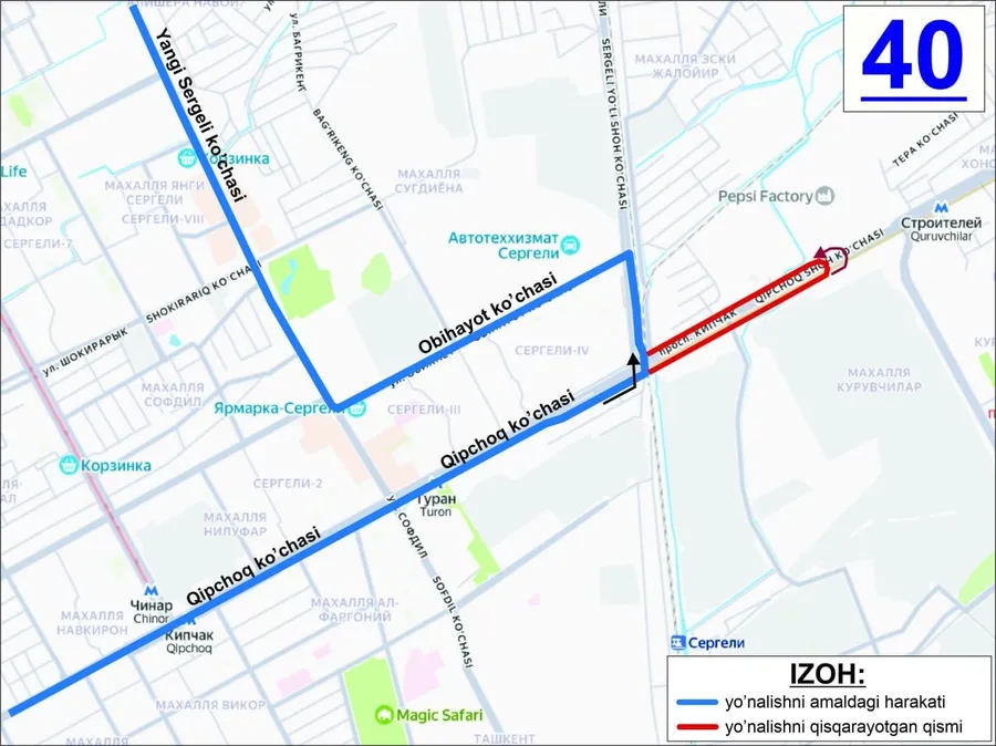 У маршрута №40 («Сергели-12 — Ташкент вокзали») изменилась схема движения в сторону вокзала. Автобусы будут ехать по улицам Кипчак, Сергели и Обихает, без разворота на мосту.