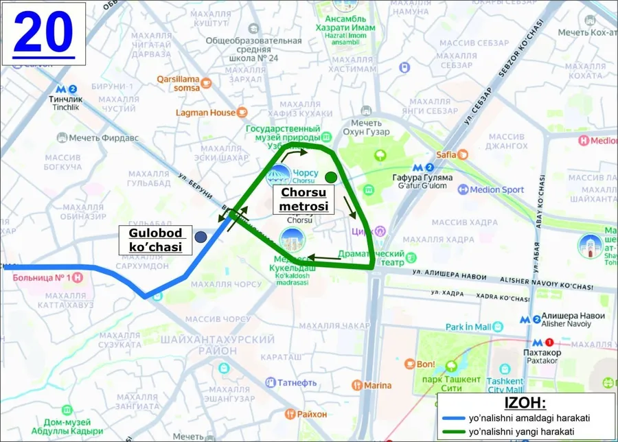 Маршрут №20 («Ибн Сино — Гулобод») продлят до станции метро «Чорсу». Теперь автобусы будут доезжать от улицы Гулобод через улицы Сакчмон и Заркайнар до метро. Обратный путь после «Чорсу» пройдет по улицам Заркайнар, Навои, Беруни и Лайлитогон.